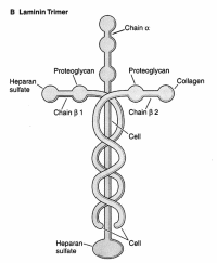 цепей (α, β, γ), которые укладываются в пространстве в крестообразную структуру, на различных ответвлениях которой имеются домены, способные взаимодействовать практическими со всеми структурными компонентами базальных мембран: коллагеном IV типа, гепарансодержащими
