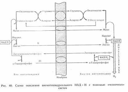 Механизм: НАДН2, образующийся в цитоплазме, например, при распаде углеводов, не проникает через мембраны митохондрий и поэтому не может непосредственно