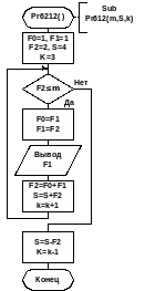 Sub P6212(ByVal m As Integer, _ ByRef S As Long, ByRef k As Integer) Dim F, F1, F2 As Integer F0 = 1 : F1 = 1 : F2 = 2 S = F0 + F1 + F2 : k = 3 Do While F2 <= m F0 = F1 : F1 = F2 vivodIntLs12(F1, ListBox1) F2 = F0 + F1 S = S + F2 K = k + 1 Loop S = S – F2 k = k - 1 End Sub