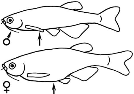 Рисунок 19.Отличительные половые признаки и строение Brachydanio rerio Hamilton-Buchanan. Самка (внизу) и самец (вверху) (Кочетов А.М., 1991).