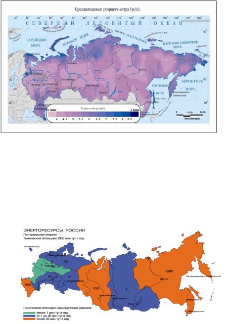 На рисунке 1 отмечено, в какой части России скорость ветра самая высокая. Гигантские ветряные турбины генерируют электричество когда ветер вращает их огромные лопасти. Лопасти подключены к генератору, вырабатывающему электричество. Крупные ветровые электростанции могут удовлетворить основные энергопотребности. Одиночные ветряки могут вырабатывать электричество для сельского дома, телекоммуникационного оборудования и водяных насосов. Как и в случае с солнечными батареями, постройка ветряной электростанции требует значительных начальных инвестиций, которые не обязательно быстро окупаются.