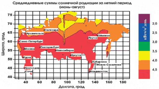 Рис. 3. Возможности использования солнечной энергии на территории России