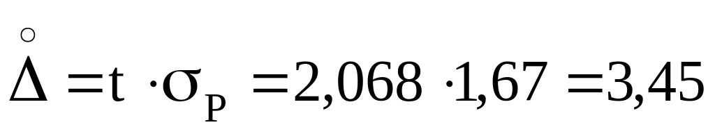 Для решаемой задачи при nэфф = 24,16 и Рд = 0,95 из таблицы 6 находим n1 = =24, t1 = 2,069, n2 = 25, t2 = 2,064, а затем вычисляем значение t = 2,068.