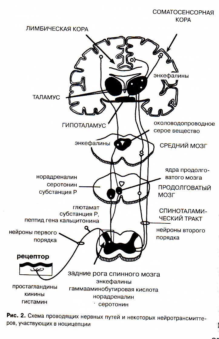 Рис. 2. Схема проводящих нервных путей и некоторых нейротрансмиттеров, участвующих в ноцицепции