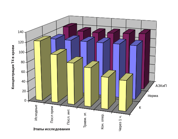 В ходе дальнейшего исследования у больных контрольной группы, несмотря на стандартную премедикацию, после поступления в операционную наблюдался подъем концентрации в крови кортизола на 133,4% от нормы, сахара - на 131,3%, С-пептида - на 114,3%, инсулина - на 83,2%. На этом этапе отмечена отрицательная динамика и уровня гормонов щитовидной железы. При выраженном повышении концентрации Т3 на 22.7%, наблюдалось снижение Т4 на 12,2% и ТСГ - на 7,7%.