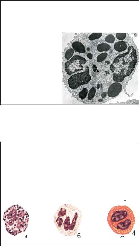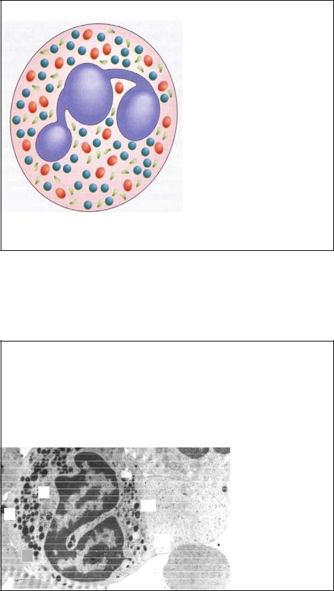 Специфические гранулы базофилов (0.5 мкм в диаметре) обладают метахромазией, т.е.окрашиваются в цвет. Отличный от цвета красителя. Это связано с присутствием гепарина. Специфические гранулы базофила не столь многочисленны, как у других лейкоцитов. И имеют неправильную форму. Дегрануляция при воспалительных и аллергических реакциях приводит к изменению свертываемости и сосудистой проницаемости. Базофилы содержат гепарин, гистамин, лейкотриены, серотонин. Лейкотриены – это медленно действующие вещества анафилаксии, образующиеся во время аллергических реакций в присутствии IgE.
