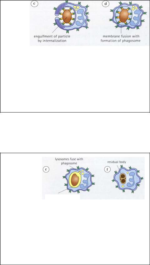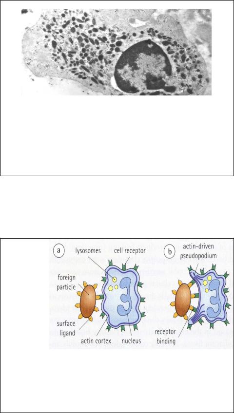 Нейтрофилы, имеющие рецепторы хемоаттрактантов (N-формил-метионил- пептидов), мигрируют в область тканевого повреждения, где они реализуют свою защитную функцию. При этом многие хемоаттрактанты являются и активаторами (метаболиты арахидоновой кислоты). Нейтрофилы способны фагоцитировать чужеродные частицы (бактерии, мертвые клетки и др.). Фагоцитоз начинается с распознавания антигена через рецепторы к опсонинам (Fc-фрагментам антител и белков комплемента, связавшихся с бактериями или их фрагментами). Цитоплазма нейтрофила содержит также различные антиоксиданты для разрушения потенциально токсичных перекисей, которые генерируются во время лизосомальной активности69 . Ps –
