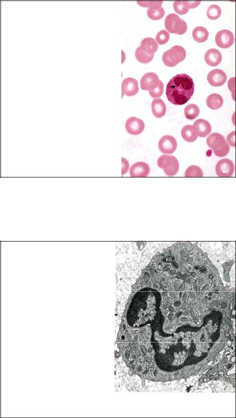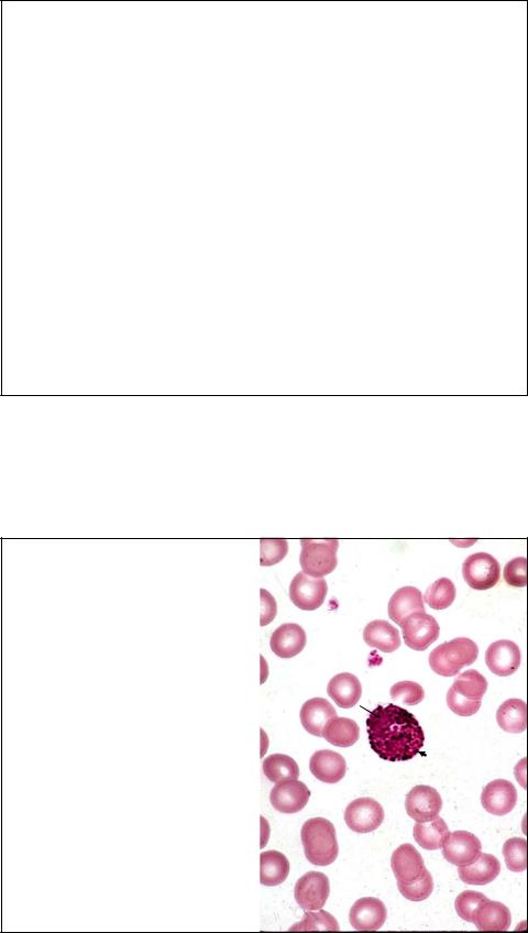 Базофилы самые малочисленные из лейкоцитов, диаметр у них 8- 10 мкм. Их цитоплазма заполнена темными крупными базофильными специфическими гранулами (головка стрелки), которые, вдавливаясь в плазмалемму, придают клетке угольчатую форму. Специфические гранулы замаскировывают не только азурофильные клетки, но и само ядро.