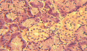 3. Препарат – Сложная разветвленная альвеолярно-трубчатая железа – подчелюстная железа. Окраска гематоксилином и эозином. Найти при малом увеличении дольку железы, образующую компактные скопления, разделенные прослойками соединительной ткани, окрашенной оксифильно. Рассмотреть при большом увеличении: концевые отделы, имеющие форму мешочков (альвеол) и трубочек; альвеолярные концевые отделы сформированы интенсивно окрашенными сероцитами (1), вырабатывающими белковый секрет и имеющими базофильную цитоплазму и округлые ядра; трубчатые концевые отделы выделяют смешанный, белково-слизистый секрет и представлены сероцитами, мукоцитами со светлой цитоплазмой и уплощенными ядрами (2); выводные протоки, округлые или овальные, расположенные в дольках или между ними (3). Обратить внимание на миоэпителиальные клетки с палочковидными ядрами, примыкающие снаружи к концевому отделу. См. рис.6.