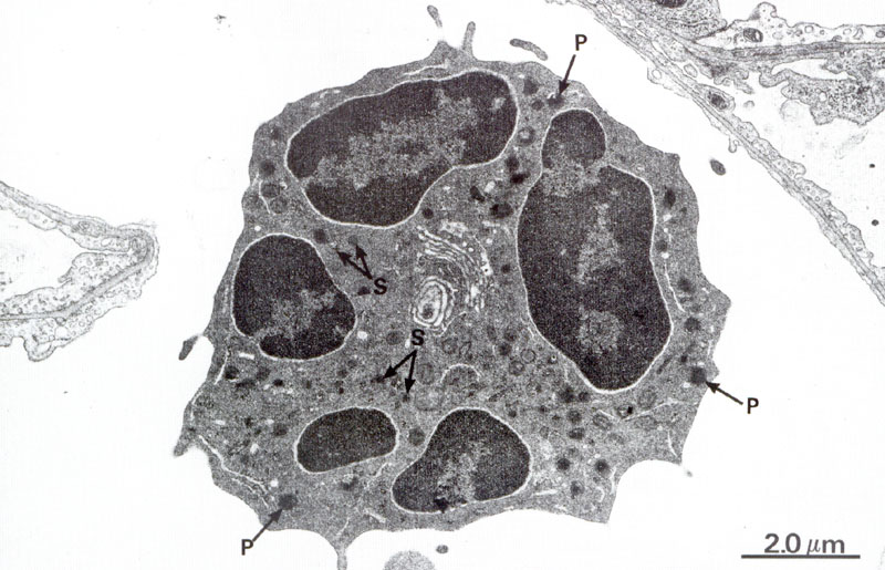 Ядро нейтрофила состоит из 5 сегментов. В них хроматин конденсирован – что является признаком низкой синтетический активности белка. В цитоплазме множество гранул. Первичные гранулы (Р) – сферической формы электронно-плотные аналогичны лизосомам. Преобладают вторичные гранулы (S), – более мелкие, разнообразной формы и электронной плотности.