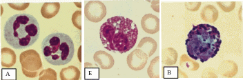 Рис. 4.9. Гранулоциты: А – нейтрофильный лейкоцит, Б – эозинофильный лейкоцит,