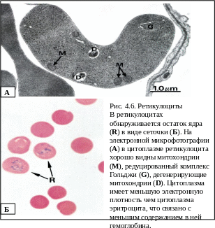 Обязательной составной частью популяции эритроцитов являются их молодые формы (1-5%), называемые ретикулоцитами, или полихроматофильными эритроцитами. В них сохраняются рибосомы и эндоплазматическая сеть, формирующие зернистые и сетчатые структуры (substantia granulofilamentosa), которые выявляются при специальной суправитальной окраске (рис. 4.6).