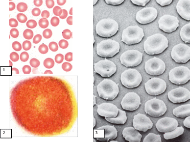 При сканирующей электронной микроскопии 4.5. (3), а также 4.4. отчетливо видно, что эритроциты имеют форму диска, что значительно увеличивает площадь поверхности клетки, через которую осуществляется газообмен. Кроме того, благодаря такой форме облегчается передвижение клетки, имеющей диаметр 7,2 mm по мелким капиллярам с диаметром 3-4 мм.