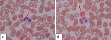 Рис. 4.11. Палочкоядерные (а) и сегментоядерные (б) нейтрофилы (х1200).
