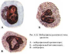 В ядре гетерохроматин занимает широкую зону по периферии ядра, а эухроматин расположен в центре. Для женщин характерно наличие в ряде нейтрофилов полового хроматина (Х-хромосома) в виде барабанной палочки – тельца Барра. В популяции нейтрофилов крови могут находиться клетки различной степени зрелости – юные (метамиелоциты), палочкоядерные и сегментоядерные (рис. 4.11. Б).