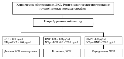 Примечание: В настоящее время полностью доказана тесная связь между тяжестью сердечной дисфункции (прежде всего, ЛЖ) и содержанием натрий-уретических пептидов в плазме, что позволяет рекомендовать определение концентрации этих пептидов в качестве «лабораторного теста» ХСН. Наиболее полно в настоящее время охарактеризованы N-концевой предсердный натрий-уретический пептид, мозговой натрий-уретический пептид (BNP) и его предшественник, N-концевой МНУП (NT-pro BNP)