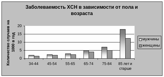 Заболеваемость сердечной недостаточностью повышается с возрастом как у мужчин, так и у женщин (рис 12), хотя до 70 – 75 лет в каждой возрастной группе женщин-пациенток достоверно меньше (McMurray, 1993). В России наибольший процент заболеваемости приходится на возраст 60-70 лет, как у мужчин, так и у женщин. В более старших возрастных группах (более 69 лет) существенно преобладают женщины (Терещенко С.Н. и соавт., 2004).