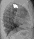 Рисунок12.Недиагностированноеновообразованиеверхнейдолиправоголёгкого.Рентгенограммыоргановгруднойполостивпереднезадней(а)иправойбоковой(б)проекциях.ВS1правоголёгкогоотмечаетсязоналокальногоусилениялёгочногорисунка(стрелка),объёмверхнейдолисохранен.
