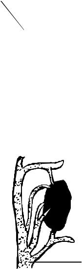 Гортань розташовується наперед, а глотка, що за нею спус- кається, утворює з кожного боку від неї грушоподібні ямки. Заперсневидна ділянка розташовується за персневидним хря- щем (рис. 28).