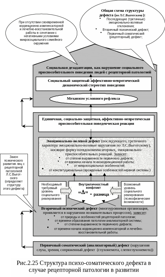 Представление о наиболее общих закономерностях психического развития лиц с рецепторной патологией, а также о сложной многоуровневой структуре их психосоматического дефекта можно получить, рассмотрев рис.2.25.