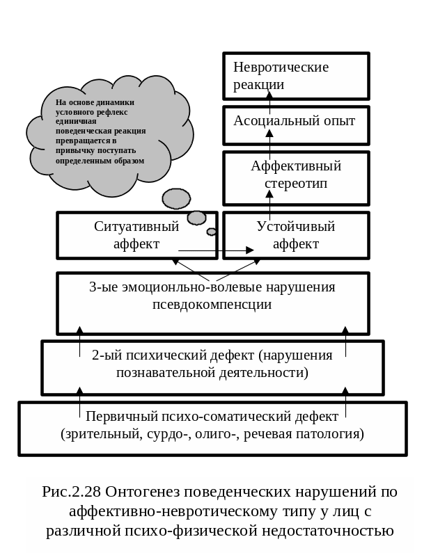 В отличии от глухонемых, у слабослышащих, глухих, слабовидящих и слепых существует общая схема развития псевдокомпенсций, которые следует рассматривать как социально защитные невротические поведенческие реакции на уровне своих психофизических возможностей с учетом индивидульной конституциональной предрасположенности психики и сопутствующих нейроаномалий в развитии (см.рис.2.28).