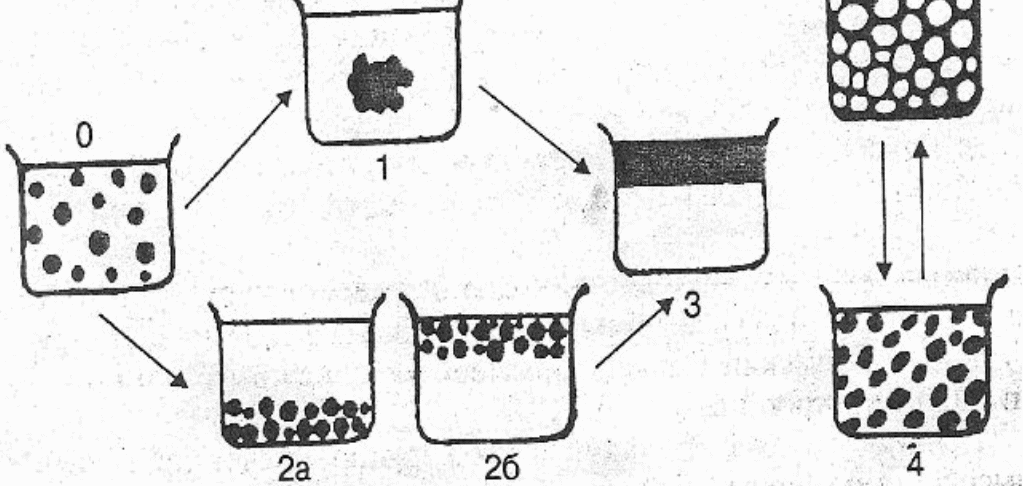 2 – кинетическая неустойчивость (расслоение): 2а – седиментация; 2б – кремаж; 3 – коалесценция (разрушение);