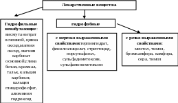 Диспергирование заключается в том, что требуемая степень дисперсности достигается путем раздробления грубодисперсного вещества. В основе же конденсационного способа лежит другой принцип: соединение молекул в более крупные частицы – агрегаты, имеющие размеры, типичные для суспензий (пройдя стадию коллоидных частиц). Технология изготовления суспензий дисперсионным методом определяется физико-химическими свойствами лекарственных веществ, входящих в ее состав, которые по отношению к воде разделяют на две группы: гидрофильные и гидрофобные (см. рис. 2).
