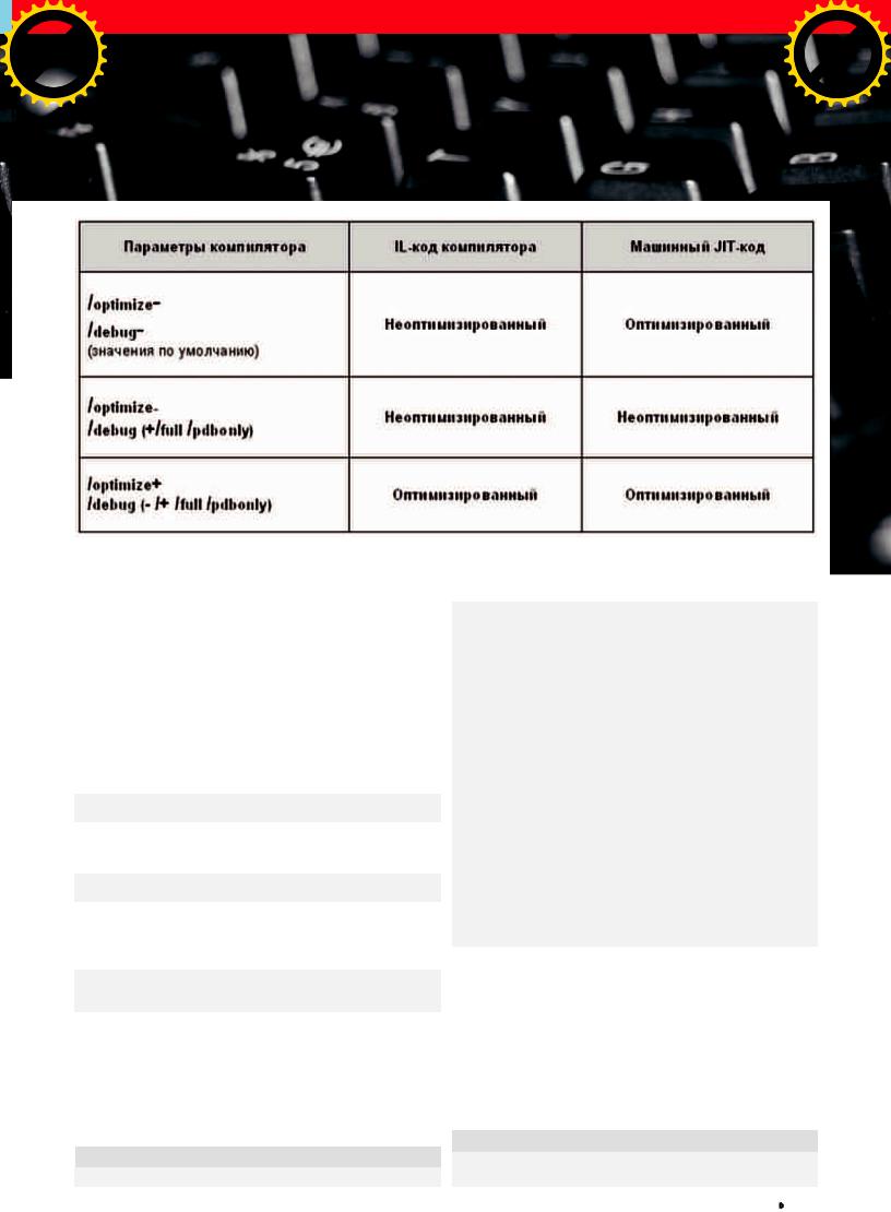 СуществуетдвапараметракомпилятораC#, которыевлияютнаопти- мизациюкода— /optimize и/debug. Вприведеннойтаблицетыможешь увидетьвариантыихиспользования— какговорится, «почувствуйте разницу»