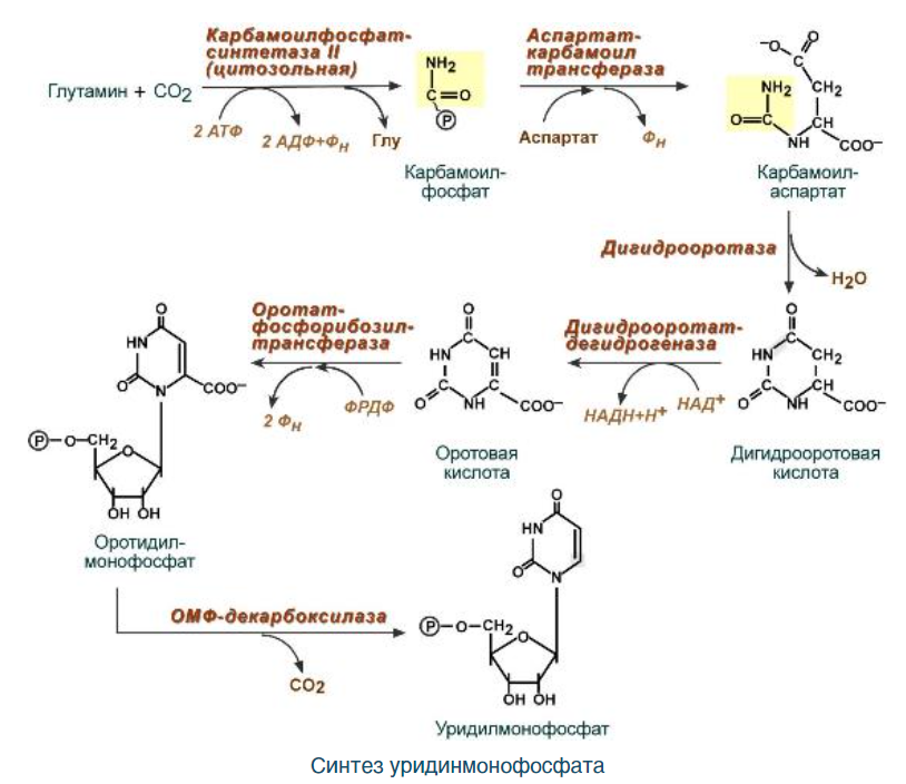 1) карбамоилфосфатсинтетазы, которая обеспечивает снабжение биосинтетического пути одним из первых субстратов — карбамоилфосфатом (этот пункт регуляции является основным у высших животных (млекопитающих), включая организм человека); аллостерическим ингибитором фермента является УТФ - конечный продукт биосинтетического пути; вместе с тем ФРПФ — интермедиат пуринового синтеза — увеличивает активность фермента, являющегося одним из механизмов обеспечения координированного синтеза пуринов и пиримидинов;