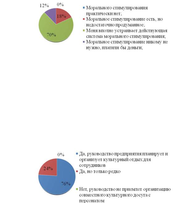 Следующий вопрос анкеты помог, выявить как руководство оценивает труд сотрудника, в результате, только 51% респондентов ответили, что справедливо. Тем самым используя формы морального стимулирования, так 55% респондентов ответили, что вполне устраивает действующая форма морального стимулирования. Тем самым можно сказать, что в предприятии слабо ценят труд сотрудников (рис. 2.7).