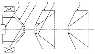 Несамостоятельный дуговой разряд горит между накаленным катодом 1 и анодом 4. Форма электрода 2 обеспечивает сжатие плазмы в выходном окне (осуществляется геометрическое контрагирование). Дополнительное сжатие плазмы достигается магнитной фокусирующей системой 3. В выходном окне анода предусмотрена жаропрочная вставка 5. Электрод 6 в зависимости от знаков поданного на него напряжения вытягивает из плазмы поток электронов или ионов.