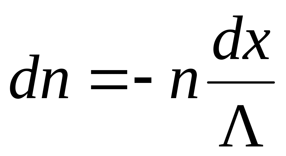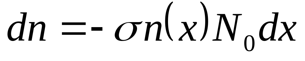 Если поток частиц с концентрацией n проходит сквозь слой газа единичного сечения, то в результате актов взаимодействия, приводящих к рассеянию частиц потока, их концентрация на пути dx уменьшится на величину | dn |, пропорциональную n, dx и концентрации атомов газа N0 :