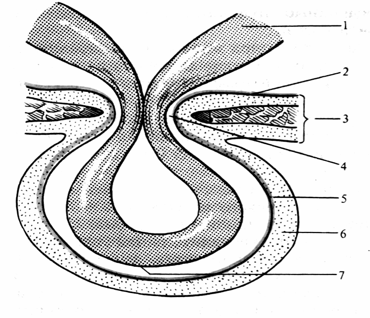 Рис. 10. Элементы грыжи. 1 – кишка; 2 – брюшина; 3 – брюшная стенка; 4 – грыжевые ворота; 5 – грыжевой мешок; 6 – кожа и подкожная клетчатка; 7 – грыжевое содержимое.