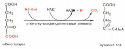 Во время четвертой реакции происходит окислительное декарбокси-лирование α-кетоглутаровой кислоты с образованием высокоэнергетического соединения сукцинил-КоА. Механизм этой реакции сходен с таковым реакцииокислительного декарбоксилирования пирувата до ацетил-КоА, α-кетоглутаратдегидрогеназный комплекс напоминает по своей структуре пируватдегидрогеназный комплекс. Как в одном, так и в другом случае в реакции принимают участие 5 коферментов: ТПФ, амид липоевой кислоты, HS-KoA, ФАД и НАД+.