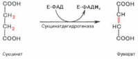 В результате шестой реакции сукцинат дегидрируется в фумаровую кислоту. Окисление сукцината катализируетсясукцинатдегидрогеназой, в молекуле которой с белком прочно (ковалентно) связан кофермент ФАД. В свою очередьсукцинатдегидрогеназа прочно связана с внутренней ми-тохондриальной мембраной: