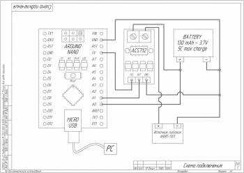 Основным компонентом предполагаемого стенда был выбран микроконтроллер Arduino Nano. Это микроконтроллер с достаточным количеством входов/выходов для подключения датчиков и управления процессом измерений, а так же с возможностью чтения как цифровых, так и аналоговых сигналов, что убирает потребность использования в данном стенде отдельного аналогово-цифрового преобразователя. Рабочее напряжение для данного микроконтроллера 5 В, а так же он оборудован стабилизатором входного напряжения, что позволит использовать широкий спектр источников питания цепи, при необходимости, в том числе и исследуемую ячейку ТАБ. В качестве основного измеряющего устройства был выбран датчик тока ACS712, позволяющий измерять силу тока с высокой точностью без сложных систем контроля и записи сигнала. Чувствительность данного датчика – 0.185 В/А. Допустимый предел силы тока, протекающий через данный датчик – 5 А, что должно быть достаточно для исследования малоемкой ячейки ТАБ. Так же для исследования цикла разрядки батареи была смоделирована нагрузка в виде резистора с высоким сопротивлением, подобранным таким образом, чтоб при разрядке ток, протекающий в цепи, не превышал максимально разрешенный производителем для данной батареи. Для зарядки батареи был использован регулируемый источник постоянного тока АКИП-1101 с максимальным напряжением 20 В и максимальной силой тока в 5 А, а так же источник постоянного тока напряжением 5 В и силой тока 0,5 А.