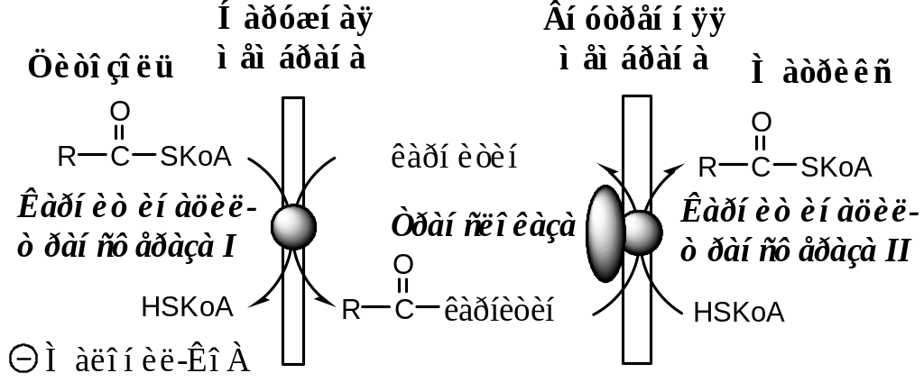В наружной мембране митохондрий фермент карнитинацилтрансфераза I (карнитин-пальмитоилтрансфераза I) катализирует перенос ацила с КоА на карнитин с образованием ацилкарнитина;