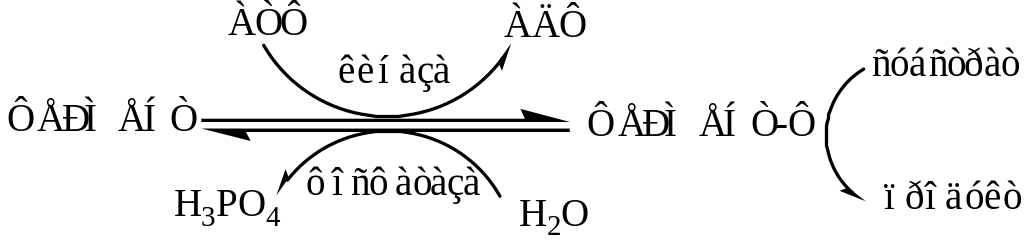 3). Регуляция каталитической активности ферментов путем их фосфорилирования/дефосфорилирования. Фосфорилирование осуществляется протеинкиназами, а дефосфорилирование – фосфопротеинфосфатазами. Введение отрицательно заряженной фосфорной группы приводит к обратимому изменению конформации и активности фермента.