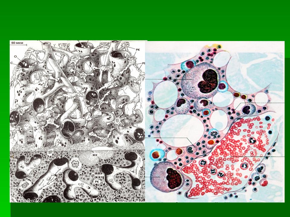 7.В строме также находятся фибробласты, жировые клетки, макрофаги, остеогенные клетки и синусоидные гемокапилляры, которые собираются в центральную венулу.