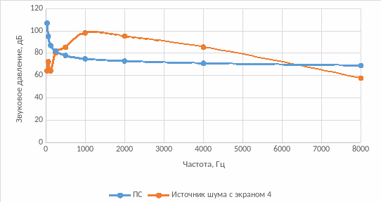 Шум при использовании экрана 4 удовлетворяет предельно допустимым значениям на низких частотах (до 250 Гц) и на более высоких частотах (от примерно 6,2 кГц), на остальных частотах превышает их
