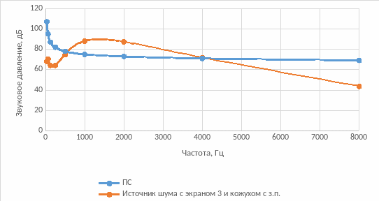 Шум при использовании экрана 3 и в кожухе с звукопоглощением удовлетворяет предельно допустимым значениям на низких частотах (до 500 Гц) и на более высоких частотах (от примерно 4 кГц), на остальных частотах превышает их