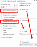 Для формирования данного отчета будет использоваться уже знакомая нам “Сводная таблица” (создание представлено на рис. 15-17). Т.к. нам необходимо вывести все сведенья о станциях, и при этом сгруппировать их по районам, то первым в “Полях сводной таблицы” в разделе Строки должно быть поле “Район расположения”. Заполненное поле сводной таблицы для этого запроса показано на рис.32, а сам отчет на рис. 33.