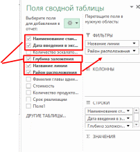 Для создания таблицы необходимо с помощью курсора перетащить необходимые поля в соответствующие области. В нашем случаи, необходимо перетащить поля “Название линии”, “Наименование станции” и “Дата введения в эксплуатацию” в область “Строки”, а поле “Глубина заложения” в область “Значения”. О том, как заполнить поля сводной таблицы, показано на рис. 18.