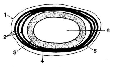 Рисунок 11. Схема строения споры: 1 – экзоспориум, 2 – слои споровой оболочки, 3 – внешняя мембраны споры, 4 – кора, 5 – внутренняя мембрана споры, 6 - сердцевина