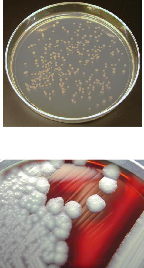 На плотных питательных средах бактерии образуют разные по форме и величине колонии - видимые скопления микроорганизмов одного вида,