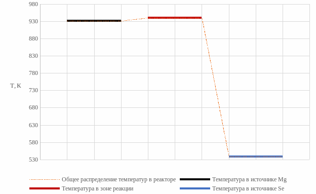 По полученным значениям температур в зонах сублимации двух реагирующих элементов и в зоне протекания реакции построим график распределения температур внутри реактора. До этого изобразим принципиальную схему реактора на рисунке 7. Само распределение температур изобразим на рисунке 8.