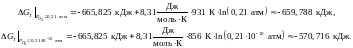 Рассмотрим два случая протекания реакции, учитывая главное условие – значение свободной энергии Гиббса. Первый случай – воздух не откачан и значение давления – 0,21 атмосферы, во втором случае воздух полностью откачан – 0,21 · 10-10 атмосферы. Рассчитаем значения свободной энергии Гиббса для двух случаях по формуле (23):