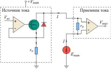 Для питания транзистора в источниках тока, построенных по рассмотренной схеме, требуется дополнительный источник питания Eпит , который обычно располагается вне модуля вывода