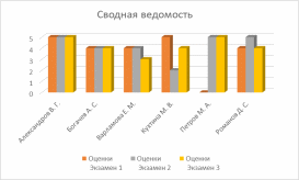 - Построим гистограмму по оценкам студентов. Для этого выделим ячейки B2:F9, затем через «Вставка» - «Объемная гистограмма с группировкой» , введем название гистограммы: «Сводная ведомость».