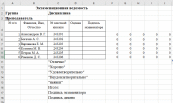 - Выполним подсчет общего числа оценок в группе, для этого активизируем ячейку Е11, щелкнув по ней, затем щелкнем по кнопке автосуммирования (∑) и выделим диапазон ячеек F5 – F10. Таким образом, в ячейке Е11 будет посчитано общее количество пятерок в группе. Повторим действия по автосуммированию для ячеек Е12 – Е15, посчитав в них общее количество соответствующих оценок.
